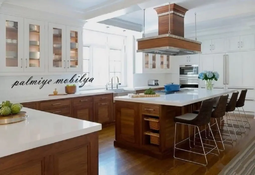 10. Beyaz ve ahşap tonlarında merkezi adalara sahip mutfaklar