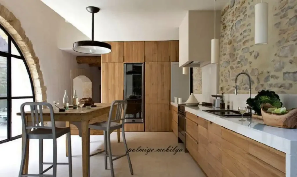 Doğal malzemelerden yapılmış bir mutfak uyumlu görünür, rahat bir atmosfer yaratır ve genel olarak, burada olmak doğayla birlik ve yakınlık duygusu yaratır. Bu duygu, neredeyse hiçbir doğal şeyin kalmadığı havasız şehirlerde özellikle değerlidir.